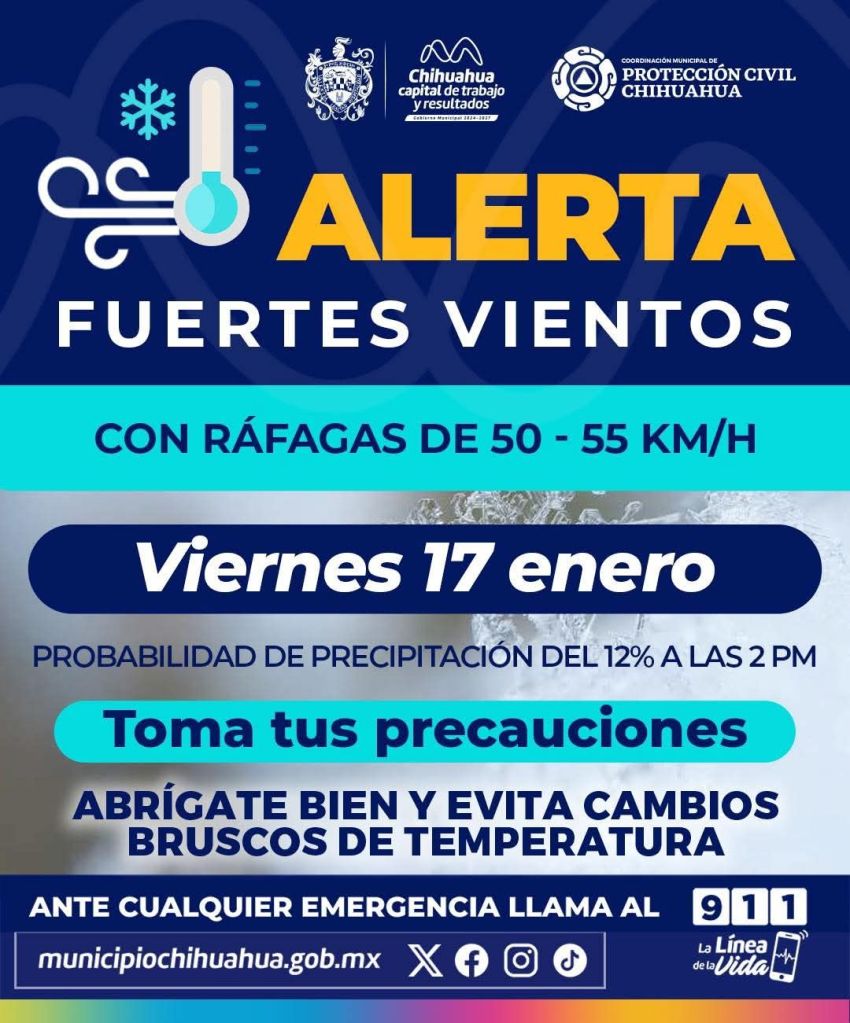 La Coordinación de Protección Civil de Chihuahua Capital emitió una advertencia ante las condiciones climáticas previstas para este viernes 17 de enero. Se espera la presencia de ráfagas de viento que podrían alcanzar velocidades de entre 50 y 55 km/h.
