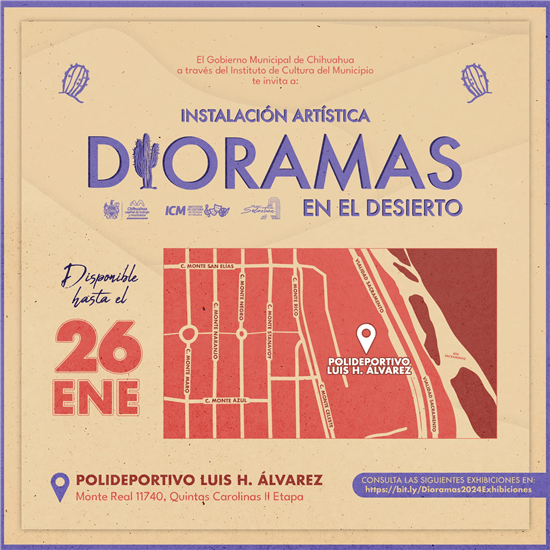 El Instituto de Cultura del Municipio anunció que la exposición Dioramas en el Desierto se encuentra en su recta final y estará disponible hasta el próximo 26 de enero en el Polideportivo Luis H. Álvarez.