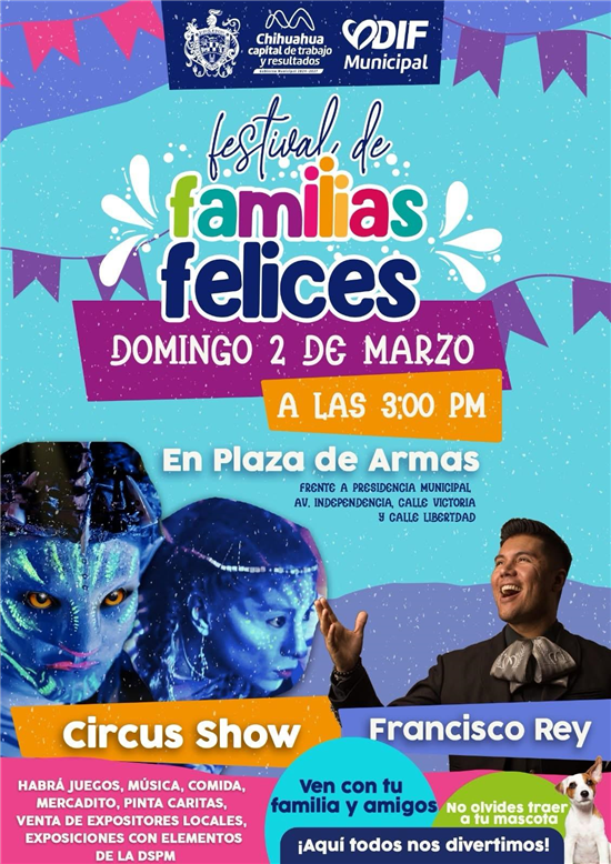 El DIF Municipal de Chihuahua invita a la ciudadanía a celebrar el Día de la Familia con el Festival Familias Felices, que se llevará a cabo el próximo domingo 2 de marzo en el Centro Histórico, a partir de las 3:00 p.m.