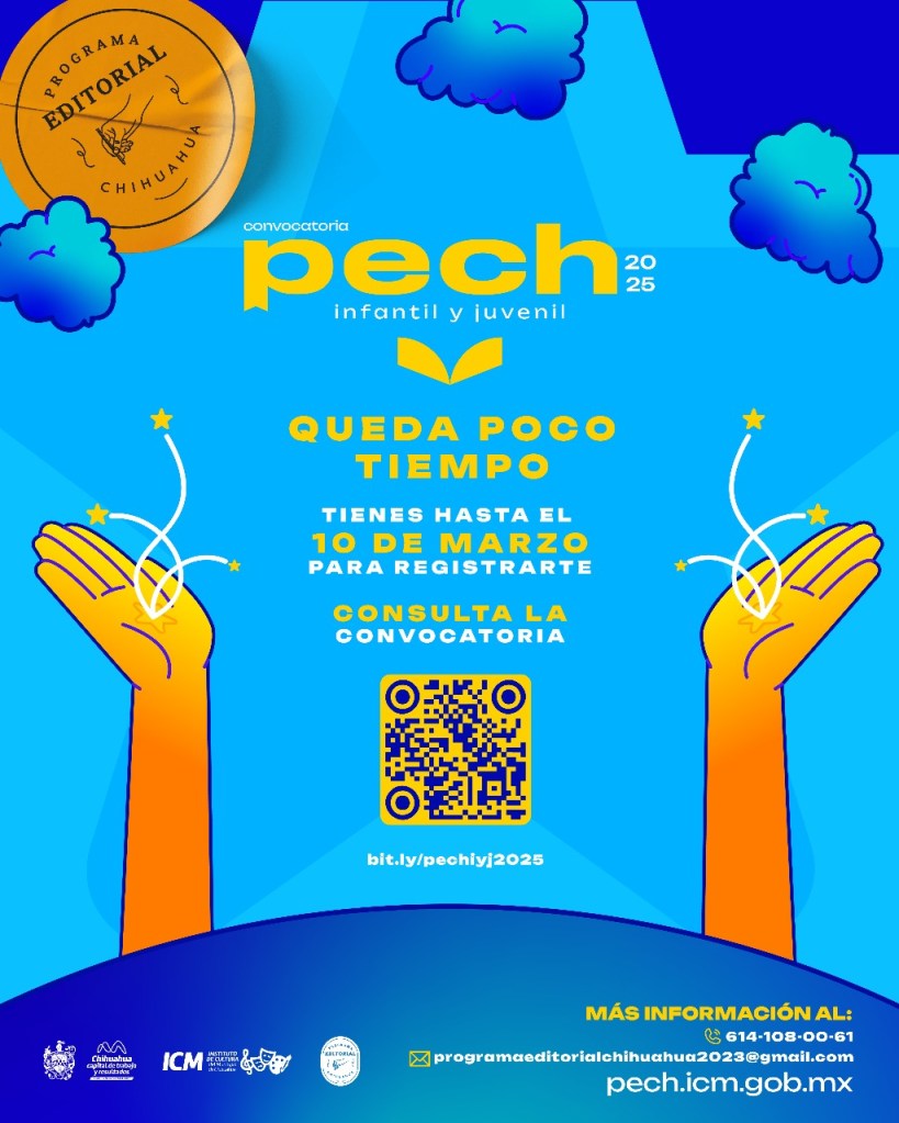 Chihuahua, Chih. A 4 de marzo de 2025.- El Instituto de Cultura del Municipio recuerda a la comunidad escritora que quedan pocos días para participar en las convocatorias del Programa Editorial Chihuahua (PECH) 2025, una iniciativa que desde 2014 ha impulsado la publicación de obras literarias de autoras y autores de Chihuahua Capital.