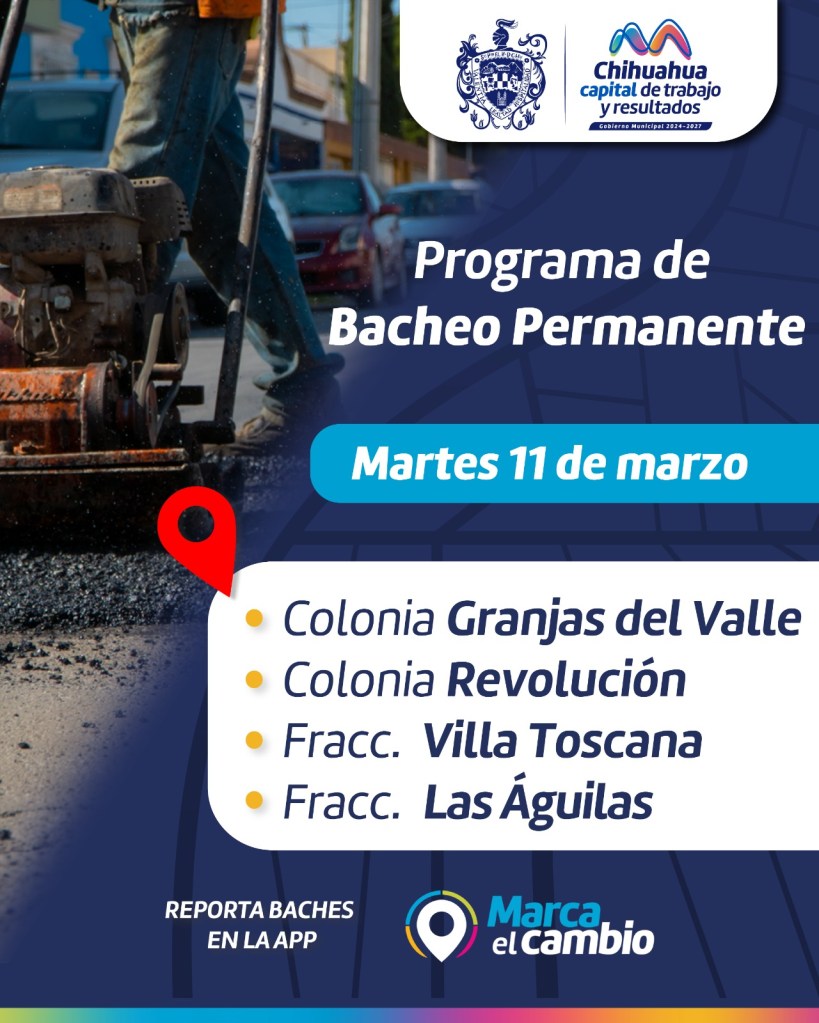 Chihuahua, Chih. A 11 de marzo del 2025.- Para mantener las calles de la capital en óptimas condiciones, el Gobierno Municipal a través de la Dirección de Obras Públicas, realizarán trabajos de bacheo el día de hoy en las colonias Revolución, Granjas del Valle y en los fraccionamientos Las Águilas y Villa Toscana.