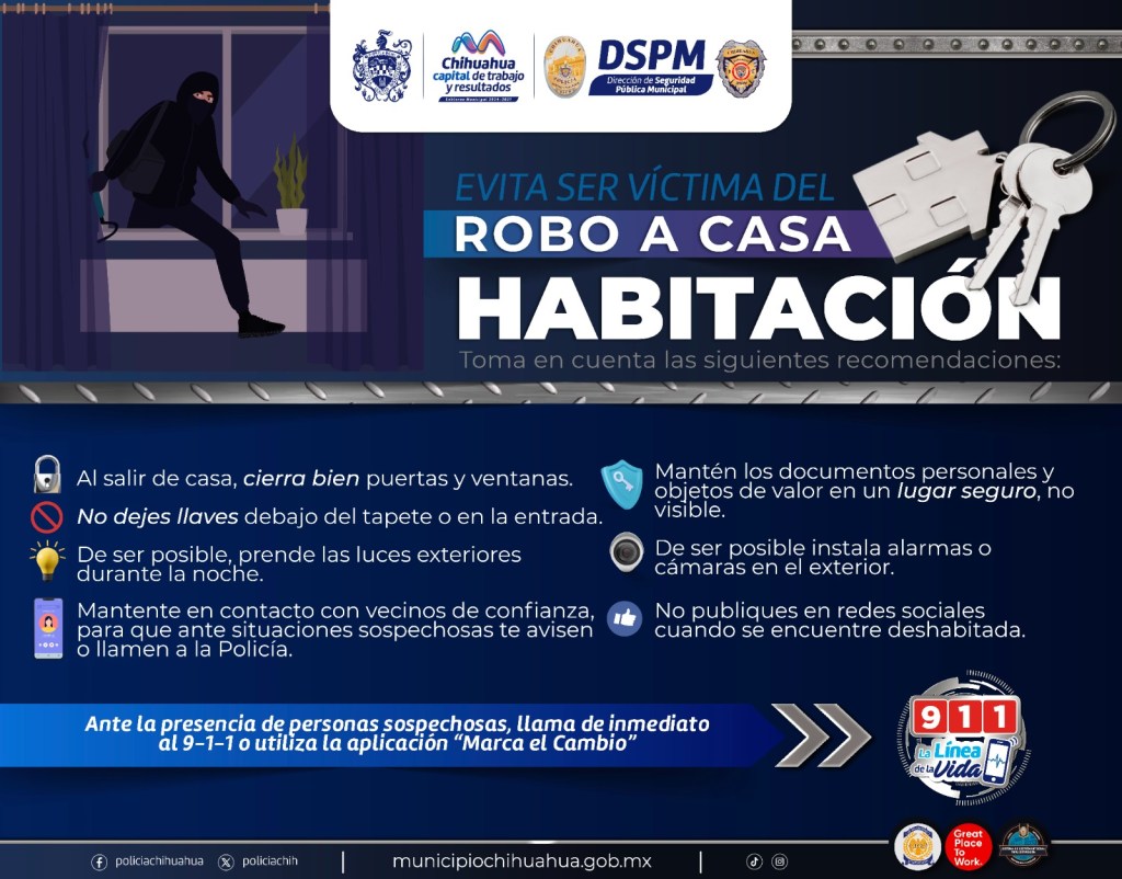 Chihuahua, Chih. A 17 de marzo de 2025.- Con el objetivo de prevenir robos en el hogar, el Gobierno Municipal a través de la Dirección de Seguridad Pública, exhorta a las y los chihuahuenses a seguir las siguientes medidas que serán de gran utilidad.