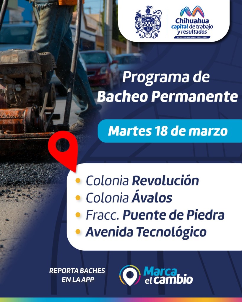 Chihuahua, Chih. A 18 de marzo del 2025.- El Gobierno Municipal a través de la Dirección de Obras Públicas, continúa trabajando con el Programa Permanente de bacheo por lo que exhorta a los ciudadanos tomar precauciones hoy martes en las colonias Revolución, Ávalos, fraccionamiento Puente de Piedra y la Avenida Tecnológico.