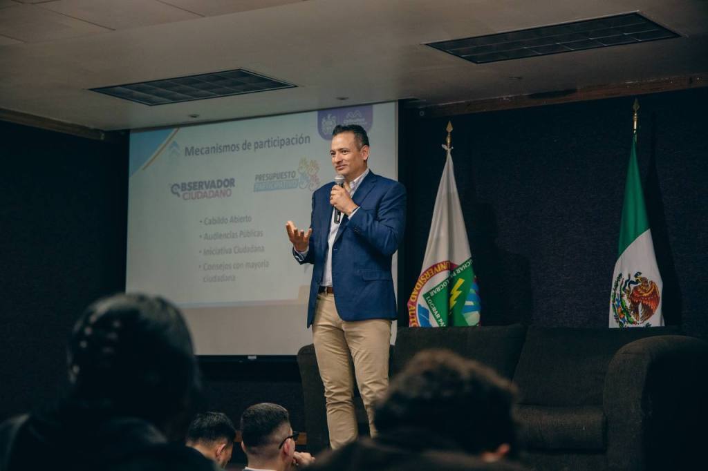 Ciudad Juárez, Chih., a 19 de marzo de 2025.- A invitación de la Facultad de Ciencias Políticas y Sociales de la Universidad Autónoma de Chihuahua (UACH) campus Juárez al evento Foro de Alcaldes, el presidente municipal de Chihuahua Marco Bonilla, expuso las acciones que desde su administración ha implementado para eficientar el recurso público, además aprovechó el espacio para exhortar a las y los jóvenes a involucrarse en la vida pública de su municipio e informarse de las acciones que realizan las administraciones públicas.