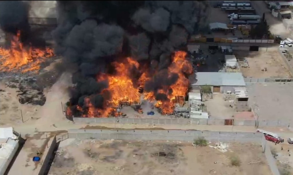 Chihuahua, Chih., a 25 de marzo de 2025.- La Dirección de Seguridad Pública Municipal y el Heroico Cuerpo de Bomberos se encuentran atendiendo el incendio registrado en una tarimera ubicada en la colonia Aeropuerto, para lo cual se procedió al desalojo en los alrededores de aproximadamente 100 personas de negocios y viviendas contiguas.