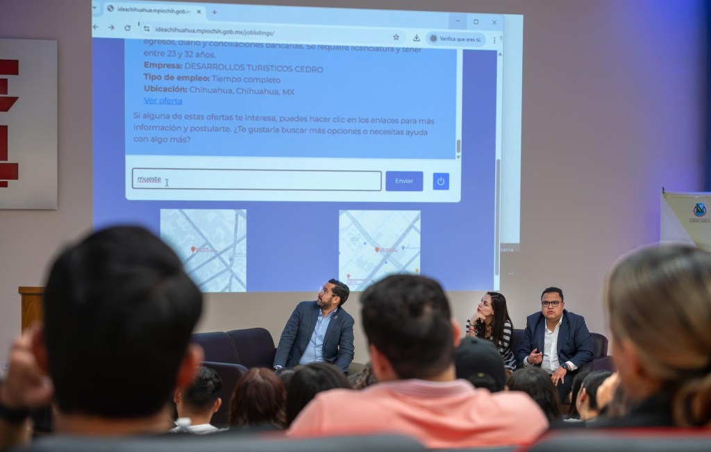 Chihuahua, Chih. A 26 de marzo de 2025.- Con el objetivo de facilitar a las y los universitarios la búsqueda de trabajo y las consultas en páginas de bolsas de trabajo o redes sociales, el Gobierno Municipal presentó el buscador de empleo virtual “ChambaBot” a alumnos de la Universidad Autónoma de Chihuahua (UACh).