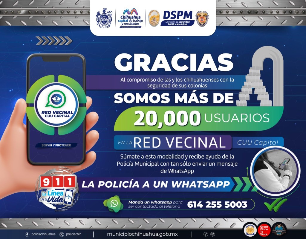 Chihuahua, Chih. A 26 de marzo de 2025.- Para seguir mejorando la seguridad en las colonias de la ciudad, el Gobierno Municipal invita a las y los chihuahuenses a continuar uniéndose a la “Red Vecinal CUU”, mediante la cual se crean grupos de WhatsApp entre los vecinos de una colonia para pedir ayuda de la Policía Municipal y de Bomberos.