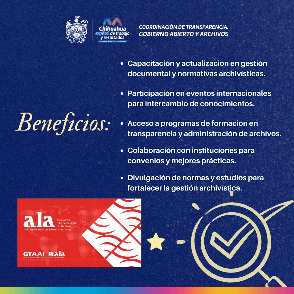 Chihuahua, Chih., a 27 de marzo de 2025.- El Gobierno Municipal, reafirmó su afiliación a la Asociación Latinoamericana de Archivos (ALA), con el objetivo de fortalecer la administración y conservación de los archivos municipales, garantizando un acceso más eficiente y transparente a la información pública.