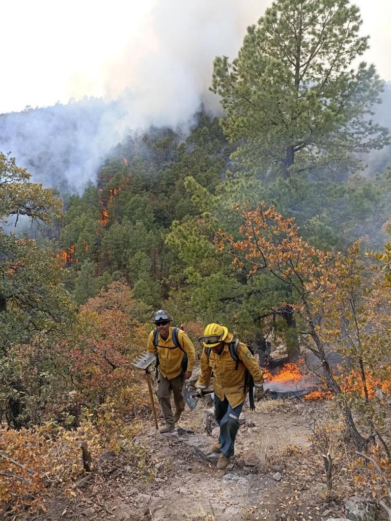 Uno de los puntos más críticos se encuentra en el Ejido Vicente Guerrero, en la colonia Ignacio Zaragoza de Campo Nuevo, donde el fuego está controlado en un 85%. En esta zona, trabajan de manera coordinada: