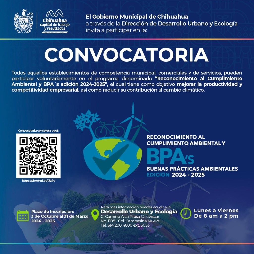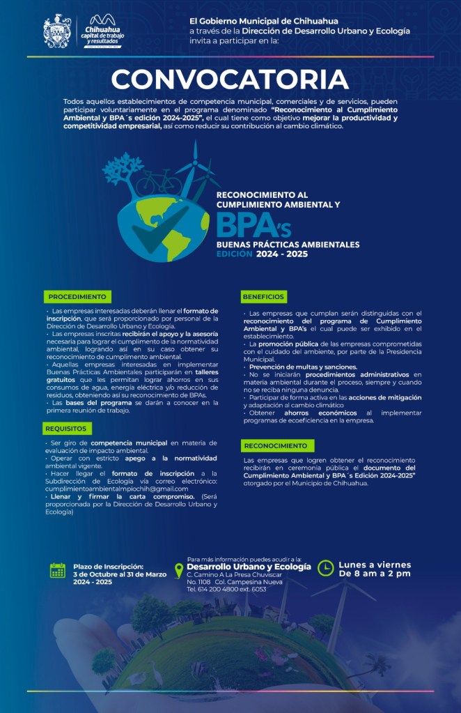 Chihuahua, Chih., a 28 de marzo de 2025.- El Gobierno Municipal, a través de la Dirección de Desarrollo Urbano y Ecología, reitera el llamado a empresas a participar en el programa “Reconocimiento al Cumplimiento Ambiental y Buenas Prácticas Ambientales” para este ciclo 2024-2025, como parte de los compromisos del Plan de Acción Climática.