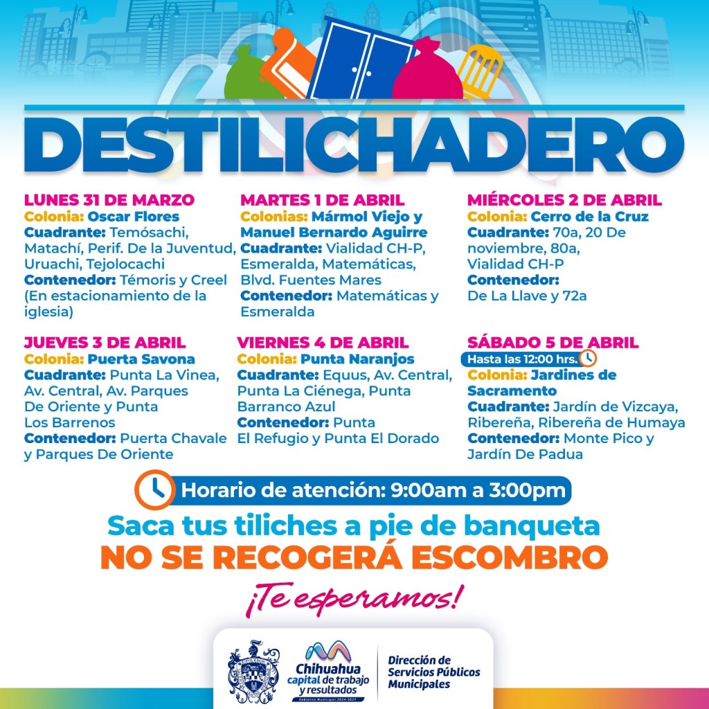 Chihuahua, Chih., a 31 de marzo de 2025.- Para evitar acumulaciones de basura de grandes dimensiones en las viviendas, que podría generar plagas o problemas de salud, el Gobierno Municipal, a través de la Dirección de Servicios Públicos Municipales, informa el calendario del programa Destilichadero, que se realizará desde hoy 31 de marzo al 5 de abril en siete colonias de la Capital.