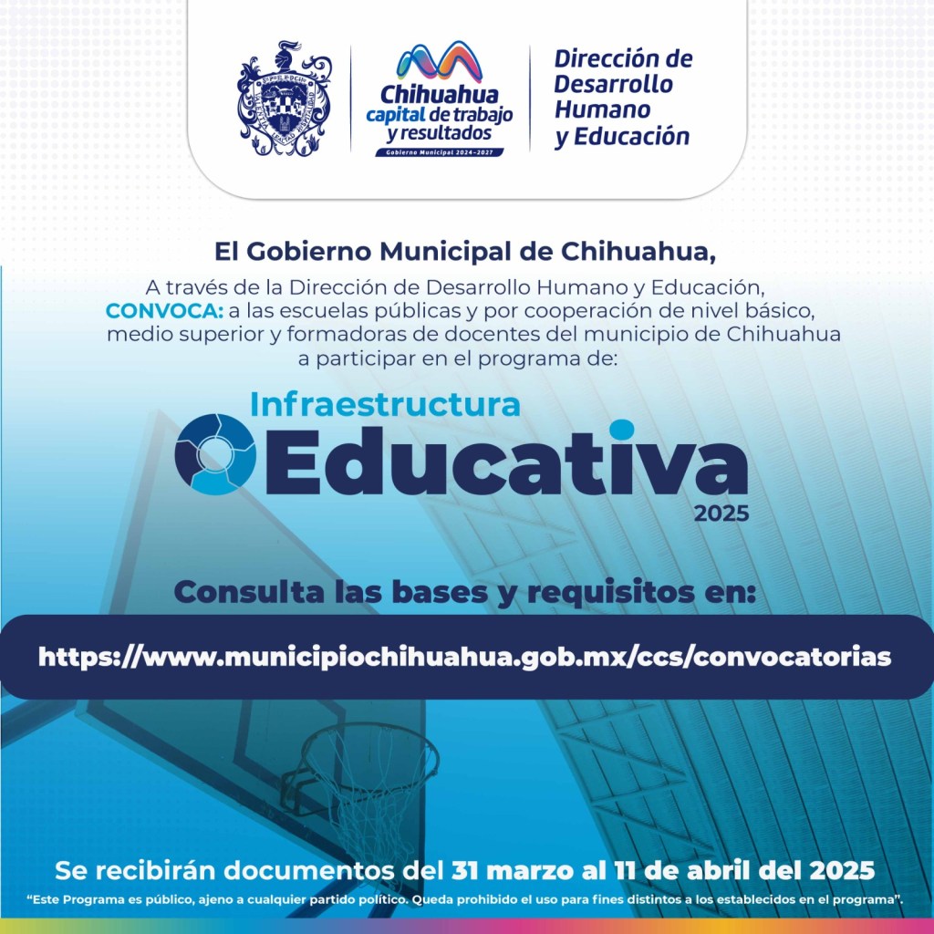Chihuahua, Chih., a 31 de marzo de 2025.- El Gobierno Municipal, a través de la Dirección de Desarrollo Humano y Educación invita a las escuelas públicas y por cooperación de nivel básico, medio superior y formadores de docentes del municipio de Chihuahua a participar en el programa de Infraestructura Educativa 2025.