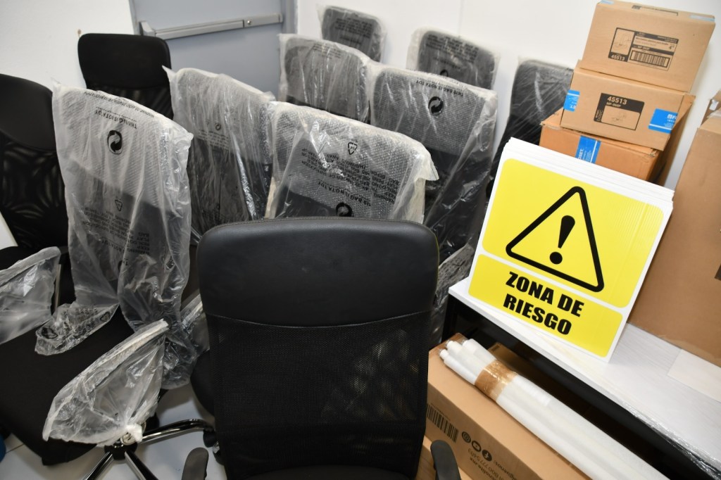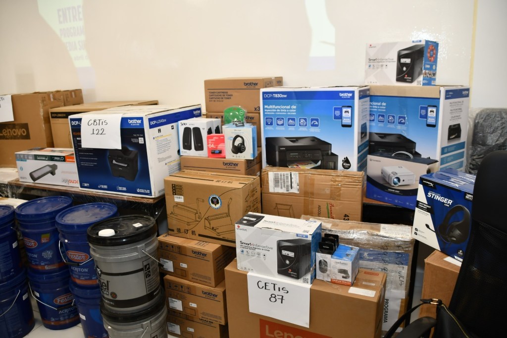 El material incluye computadoras, pantallas digitales, proyectores portátiles, discos duros, audífonos, bocinas, impresoras, multifuncionales, señalización, sillones, sillas, mesas, escritorios, lámparas exteriores, focos, pintura, impermeabilizante, dispensadores de agua, entre otros materiales.