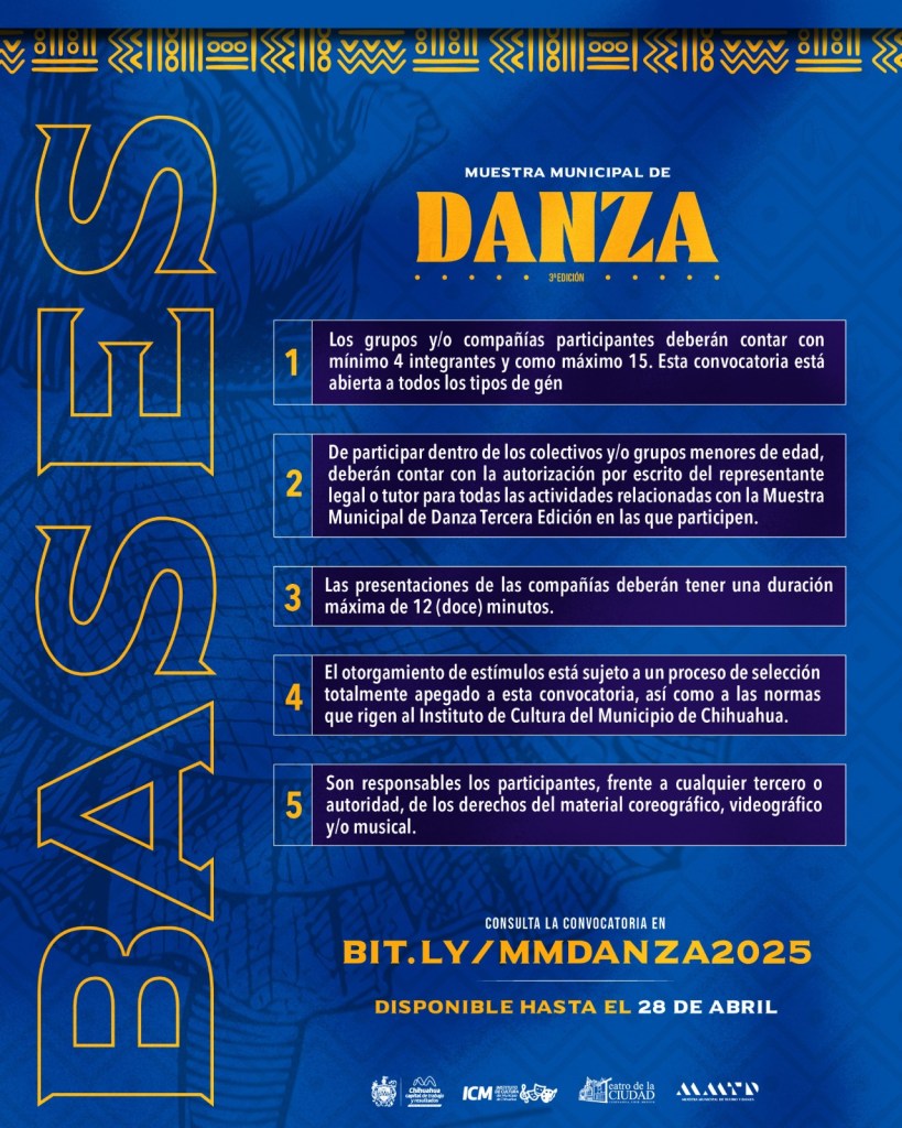Estos requisitos garantizan la transparencia y la calidad artística del evento, consolidando a la Muestra Municipal de Danza como una plataforma de exhibición y profesionalización para la comunidad dancística de Chihuahua. Los detalles completos de la convocatoria pueden consultarse en el enlace bit.ly/MMDANZA2025.