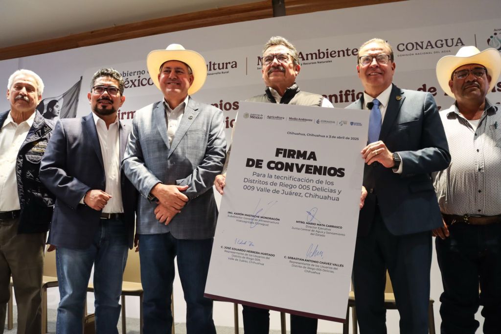 Chihuahua, 3 de abril de 2025 – En un esfuerzo conjunto por optimizar el uso del agua en el sector agrícola, la Comisión Nacional del Agua (Conagua), la Secretaría de Agricultura y Desarrollo Rural (SADER), el Gobierno del Estado de Chihuahua y productores firmaron un convenio para la tecnificación de los distritos de riego 005 Delicias y 009 Valle de Juárez.