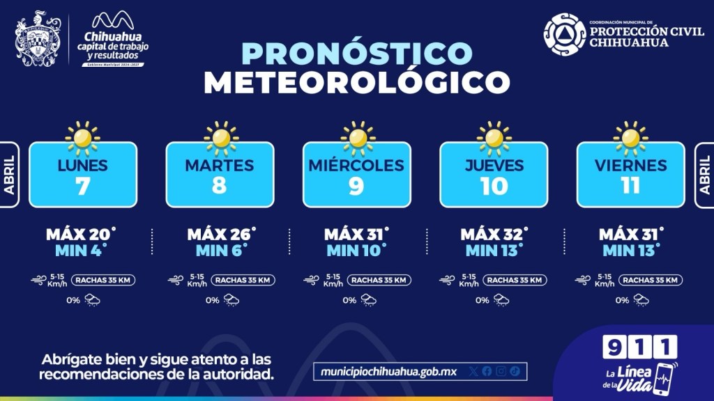Chihuahua, Chih. A 7 de abril de del 2025.- La Coordinación de Protección Civil Municipal informa que para esta semana se pronostican temperaturas máximas de 32°C con mínimas de 6°C, por lo que se exhorta a la población a no confiarse al salir de casa por los cambios de temperaturas.
