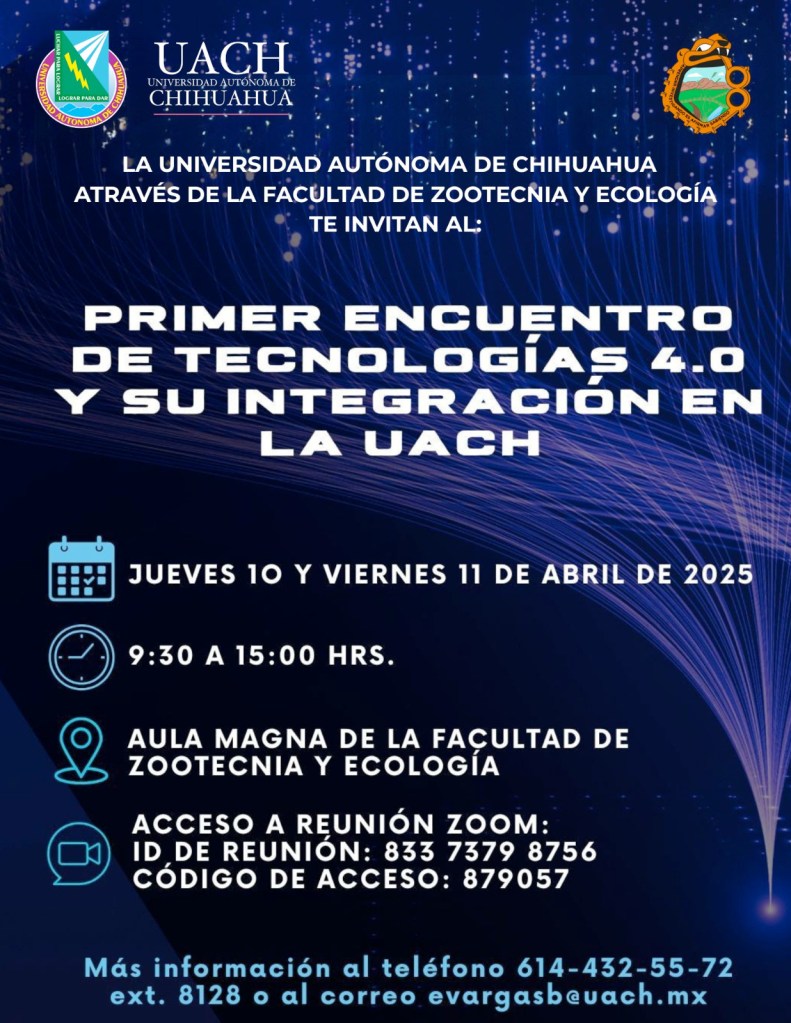 Chihuahua, Chih., a abril de 2025. – La Universidad Autónoma de Chihuahua (UACH), a través de la Facultad de Zootecnia y Ecología, invita al público en general, docentes, estudiantes e investigadores al Primer Encuentro de Tecnologías 4.0 y su integración en la UACH, un evento gratuito que busca impulsar el conocimiento y uso de tecnologías emergentes, con énfasis en la inteligencia artificial (IA).
