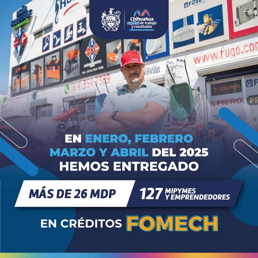 Chihuahua, Chih., 14 de abril de 2025.– El Gobierno Municipal, a través de la Dirección de Desarrollo Económico y Competitividad, ha entregado más de 26 millones de pesos en créditos a emprendedores en lo que va del año, beneficiando a 127 micro, pequeñas y medianas empresas mediante el programa FOMECH.