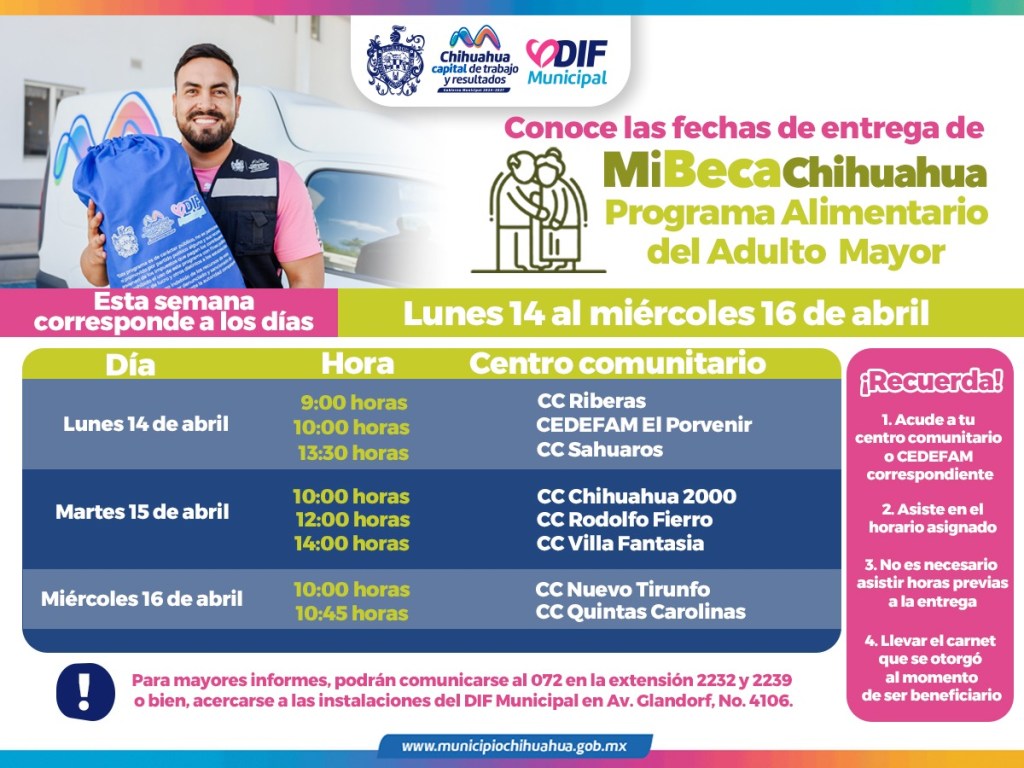 H. Ciudad de Chihuahua, Chih., a 14 de abril de 2025.– El DIF Municipal de Chihuahua dio a conocer las fechas, horarios y centros comunitarios en los que se realizará la entrega de apoyos alimentarios del Programa Alimentario del Adulto Mayor (PAAM), correspondiente a los días 14, 15 y 16 de abril.