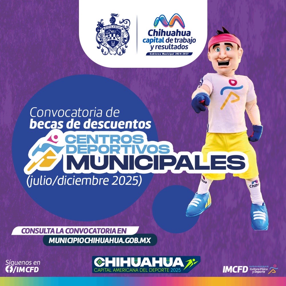Chihuahua, Chih., 16 de abril de 2025.– El Gobierno Municipal de Chihuahua, a través del Instituto Municipal de Cultura Física y Deporte, lanzó la convocatoria del programa de Becas de Descuento julio – diciembre 2025, destinado a usuarios inscritos en los centros deportivos municipales Norte, Sur, Tricentenario y “Niño Espino”.