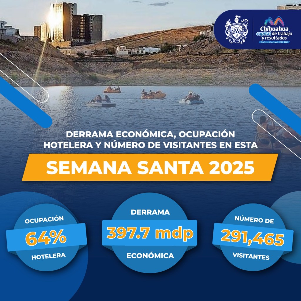 📍Chihuahua, Chih. — 21 de abril de 2025 — El Gobierno Municipal de Chihuahua reportó una derrama económica estimada en 397.7 millones de pesos durante el periodo vacacional de Semana Santa 2025, resultado del interés de la ciudadanía y turistas en las actividades turísticas, culturales y recreativas organizadas en la ciudad.