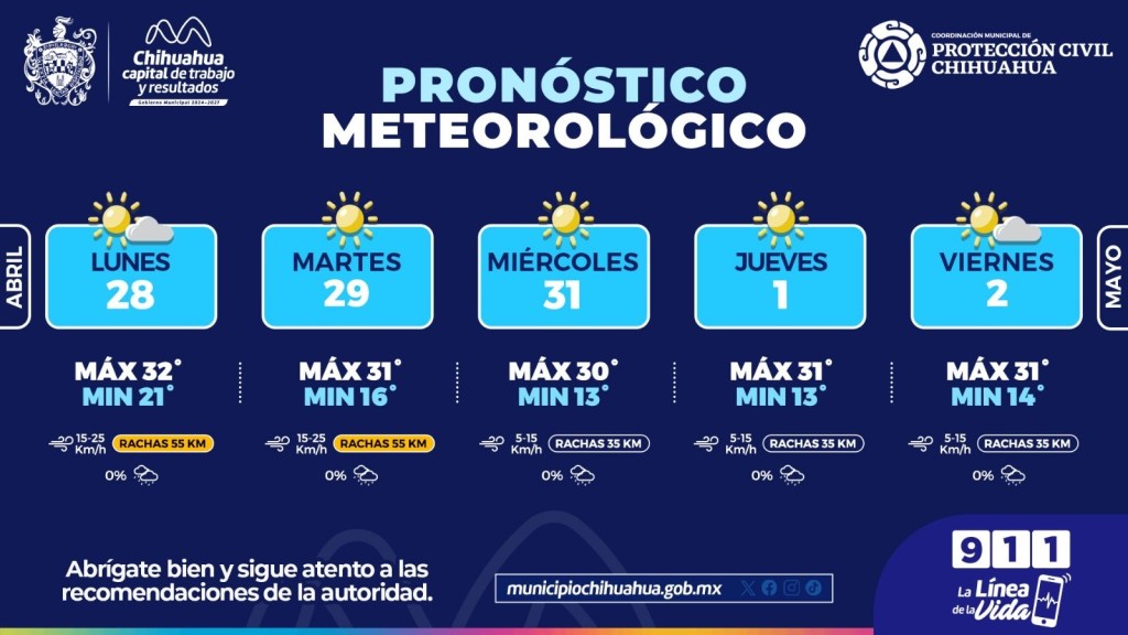 📍H. Ciudad de Chihuahua, Chih., a 28 de abril de 2025 — La Coordinación Municipal de Protección Civil informó que durante esta semana se mantendrán temperaturas altas de hasta 32°C en la ciudad, por lo que exhortan a la población a extremar cuidados y mantenerse hidratada.