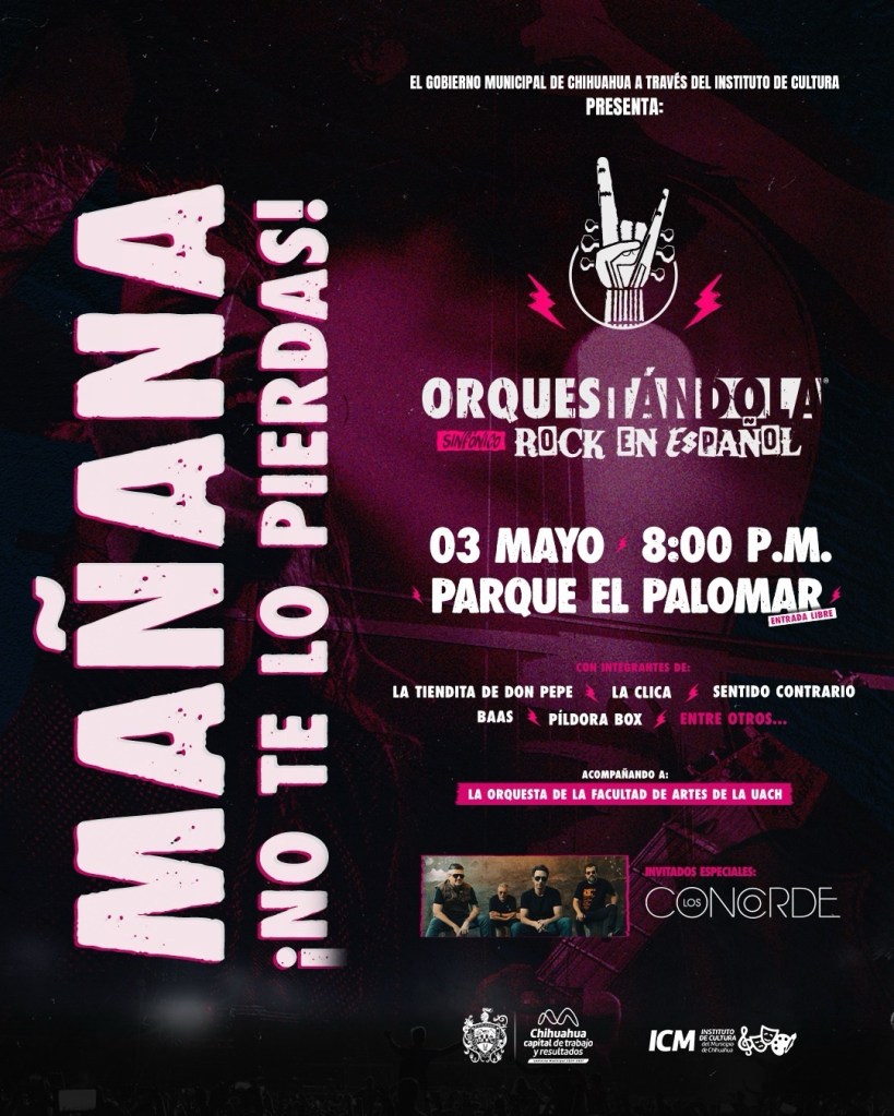 El Gobierno Municipal de Chihuahua, a través del Instituto de Cultura, invita a la ciudadanía a disfrutar de una noche mágica con el concierto “Orquestándola Sinfónico Rock en Español”, este sábado 3 de mayo a las 8:00 p.m. en el Parque El Palomar, con entrada completamente libre 🎸🎻.