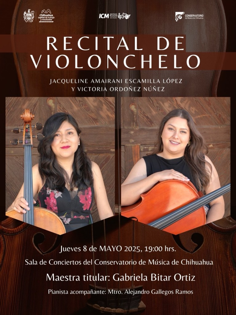 H. Ciudad de Chihuahua, Chih., a 6 de mayo de 2025.– El Gobierno Municipal de Chihuahua, a través del Instituto de Cultura del Municipio, invita a la ciudadanía a disfrutar de un recital de violonchelo gratuito, a cargo de las talentosas estudiantes Jacqueline Escamilla y Victoria Ordoñez, este miércoles 8 de mayo a las 7:00 p.m. en el auditorio del Conservatorio de Música de Chihuahua.