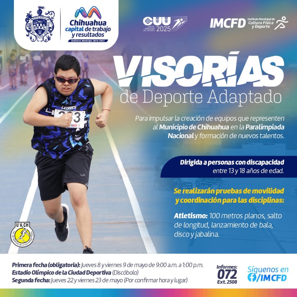 H. Ciudad de Chihuahua, Chih., a 6 de mayo de 2025.– El Gobierno Municipal de Chihuahua, a través del Instituto Municipal de Cultura Física y Deporte (IMCFD), convoca a personas con discapacidad a participar en las visorías deportivas rumbo a la Paralimpiada Nacional 2025, con el objetivo de fomentar la inclusión y descubrir nuevos talentos deportivos 💪🏼.