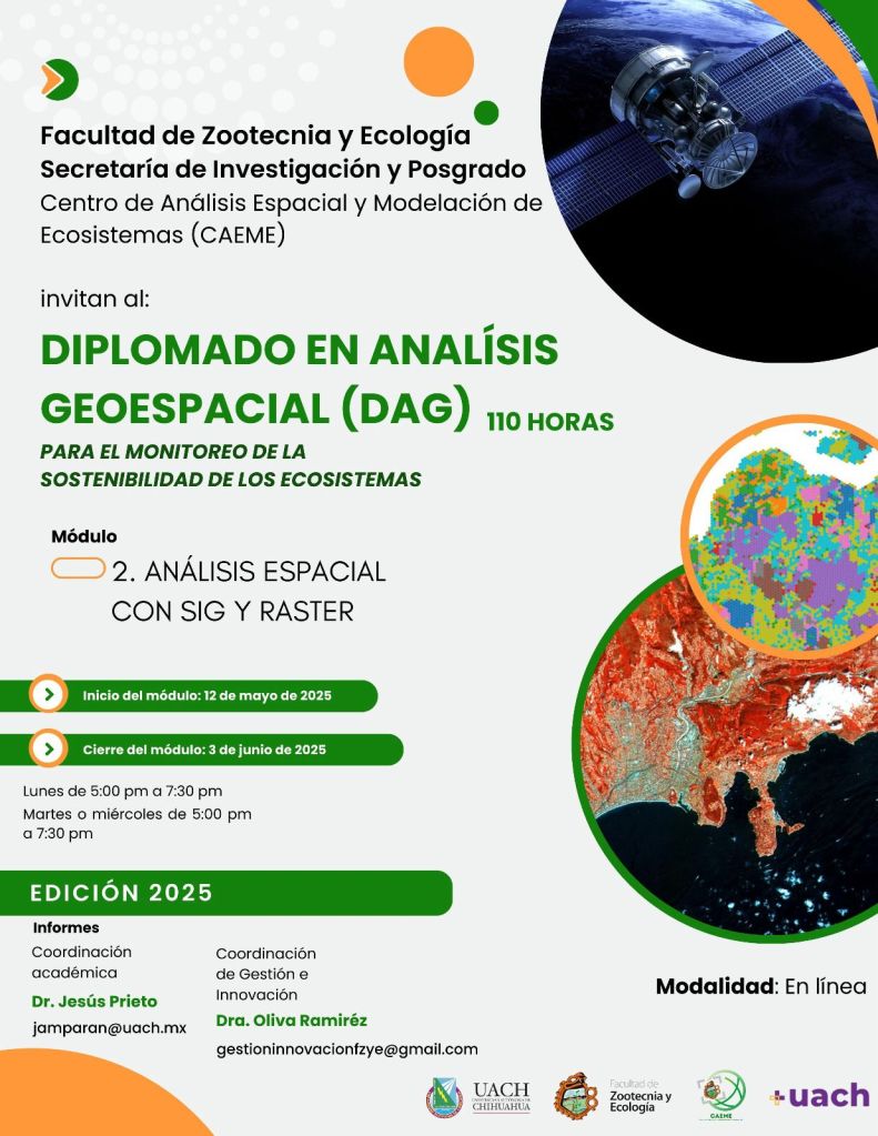 La Facultad de Zootecnia y Ecología de la Universidad Autónoma de Chihuahua (UACH), a través del Centro de Análisis Espacial y Modelación de Ecosistemas (CAEME), abre la convocatoria para el módulo 2 del Diplomado en Análisis Geoespacial 2025, que se llevará a cabo del 12 de mayo al 3 de junio, con modalidad virtual y flexible.
