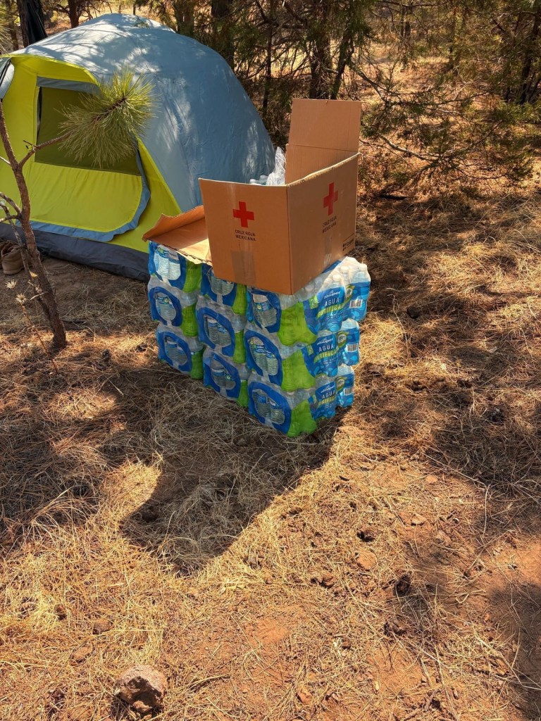 En colaboración con la Secretaría de Desarrollo Rural, la Conafor y la Cruz Roja, se entregaron agua embotellada y alimentos no perecederos a los campamentos que atienden esta emergencia.