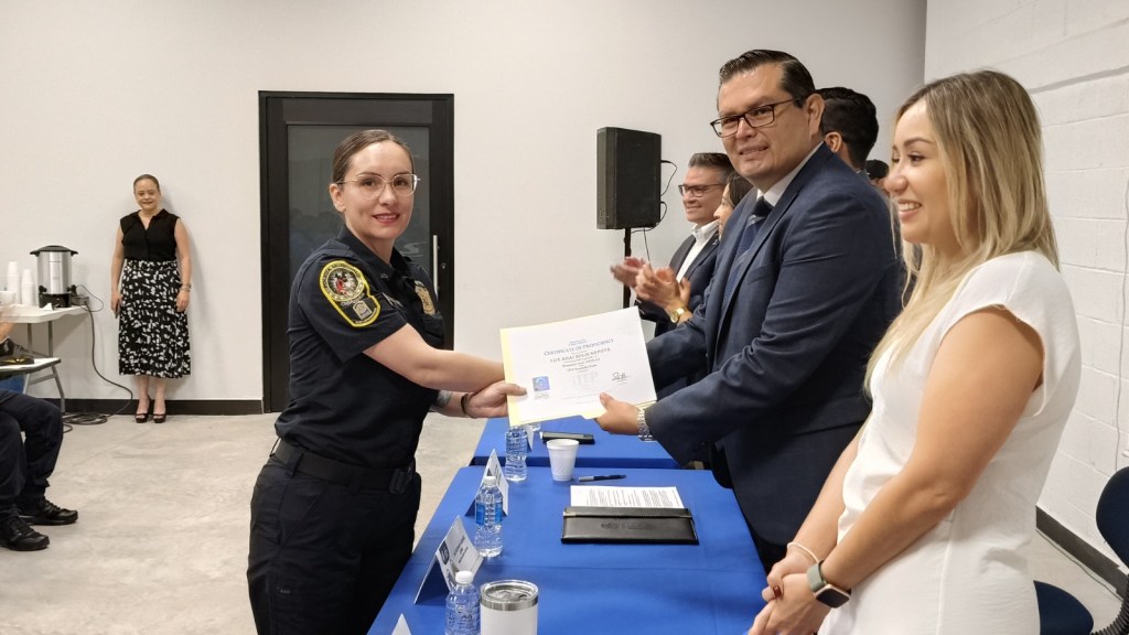 🏅 Los agentes recibieron su reconocimiento oficial durante una ceremonia en la Comandancia Sur, donde autoridades del Instituto Superior de Seguridad Chihuahua (ISSCUU), el Instituto de Apoyo al Desarrollo Tecnológico (INADET) y la Dirección de Seguridad Pública Municipal, entregaron diplomas a quienes aprobaron el examen iTEP Hospitality, tras completar 80 horas de inglés turístico.