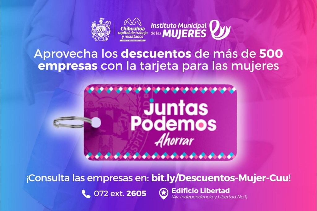 Chihuahua, Chih.– Como parte de las acciones permanentes para mejorar la calidad de vida de las mujeres y sus familias, el Gobierno Municipal de Chihuahua, a través del Instituto Municipal de las Mujeres (IMM), invita a consultar el catálogo de empresas que otorgan descuentos con la tarjeta “Juntas Podemos Ahorrar”.