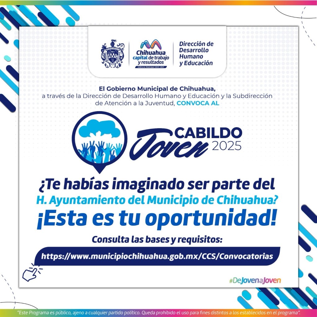 El Gobierno Municipal de Chihuahua, a través de la Dirección de Desarrollo Humano y Educación, convoca a jóvenes de entre 16 y 26 años a participar en el Cabildo Joven 2025, un ejercicio de simulación democrática que les permitirá experimentar de primera mano cómo se toman las decisiones en el Honorable Ayuntamiento.