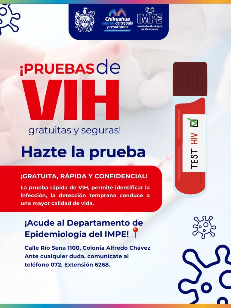 H. Ciudad de Chihuahua, Chih., a 26 de mayo de 2025.– El Gobierno Municipal, a través del Instituto Municipal de Pensiones (IMPE), reitera la invitación a todas y todos —tanto derechohabientes como población en general— a realizarse la prueba rápida de detección del Virus de Inmunodeficiencia Humana (VIH) 🧬 de manera gratuita, segura y confidencial.