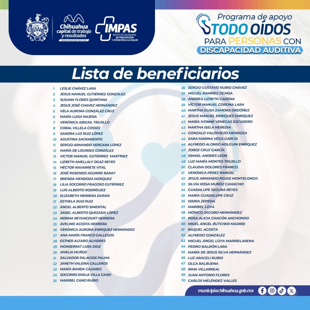 📅 H. Ciudad de Chihuahua, Chih., a 28 de mayo de 2025.– El Gobierno Municipal, a través del Instituto Municipal de Prevención y Atención a la Salud (IMPAS), dio a conocer a las personas beneficiarias de 70 aparatos auditivos, como parte del programa “Todo Oídos” edición 2025 🎉👂.
