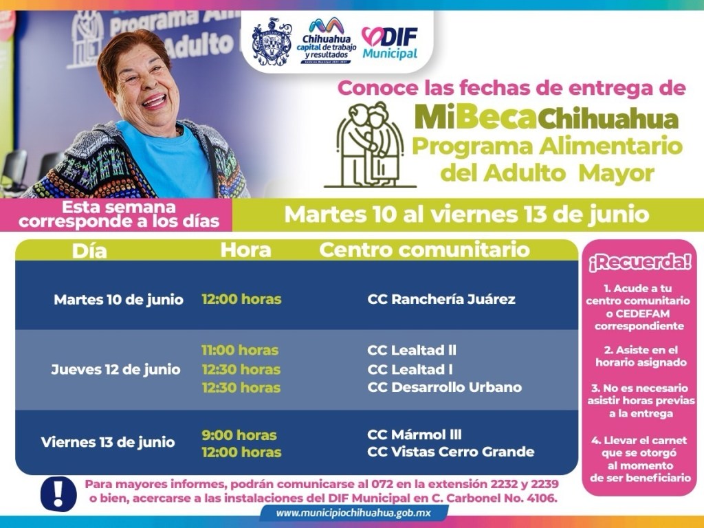 H. Chihuahua, Chih., a 8 de junio de 2025.– El Gobierno Municipal, a través del DIF, informa a las y los beneficiarios del Programa Alimentario del Adulto Mayor (PAAM) los lugares y horarios donde podrán recoger su paquete alimentario del lunes 10 al jueves 13 de junio.