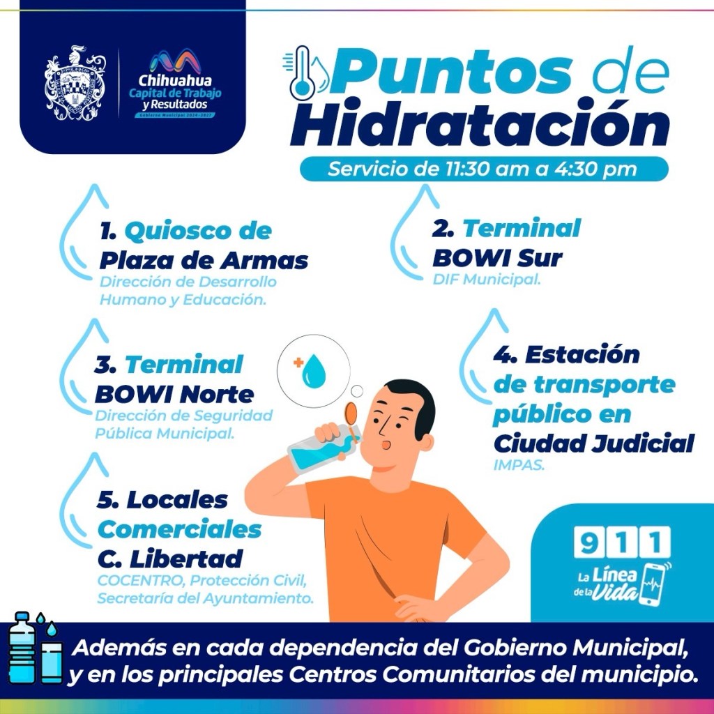 H. Ciudad de Chihuahua, Chih., a 10 de junio de 2025. – Ante el incremento de temperaturas en la ciudad, el Gobierno Municipal, a través de la Coordinación Municipal de Protección Civil, instaló diversos puntos de hidratación para brindar apoyo a la ciudadanía y prevenir afectaciones por golpes de calor.