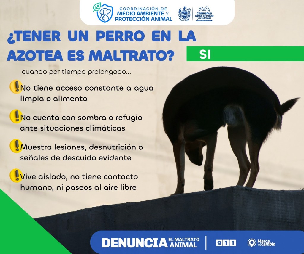 H. Ciudad de Chihuahua, Chih., a 11 de junio de 2025. El Gobierno Municipal, a través de la Coordinación de Medio Ambiente y Protección Animal, informa a la ciudadanía en qué casos tener a un perro en la azotea puede considerarse maltrato animal, así como el procedimiento que sigue la nueva brigada de Rescate Animal para atender estos reportes.