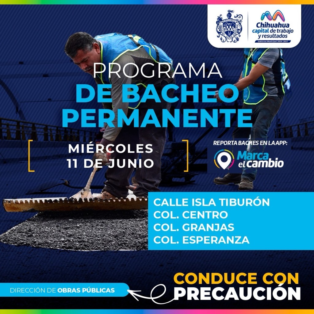 H. Ciudad de Chihuahua, Chih., a 11 de junio de 2025. El Gobierno Municipal, a través de la Dirección de Obras Públicas, informa que este martes 11 de junio se realizarán trabajos de bacheo en distintas zonas de la ciudad, como parte del programa permanente de rehabilitación de calles.