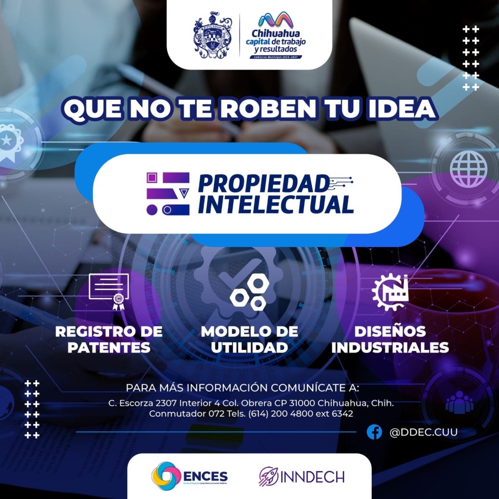 H. Ciudad de Chihuahua, Chih., a 12 de junio de 2025. El Gobierno Municipal, a través de la Dirección de Desarrollo Económico y Competitividad, en colaboración con INNDECH (Innovación y Desarrollo del Emprendimiento Chihuahuense), invita a emprendedores, investigadores y empresas a proteger sus ideas de negocio mediante el programa “Propiedad Intelectual”.