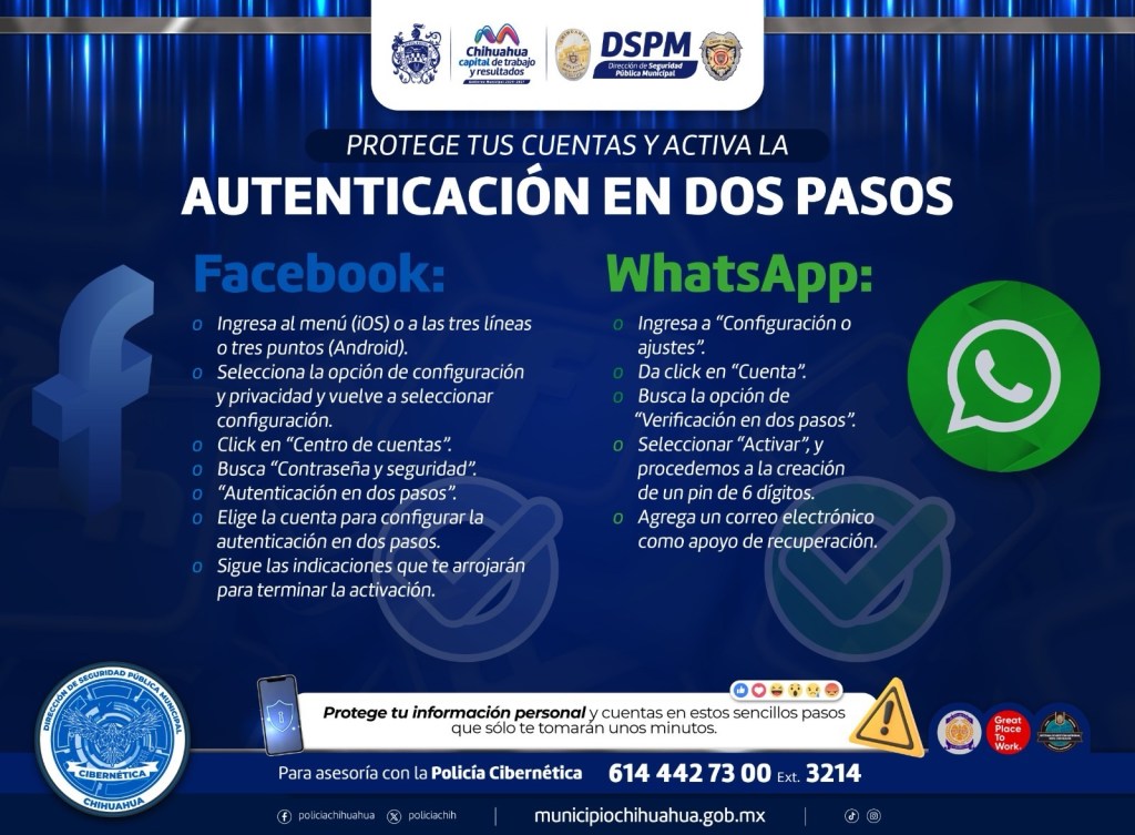 H. Ciudad de Chihuahua, Chih., a 12 de junio de 2025. Para prevenir el robo de cuentas personales en redes sociales como WhatsApp, Facebook o Instagram, la Dirección de Seguridad Pública Municipal (DSPM), a través de la Policía Cibernética, recomienda a la ciudadanía activar la verificación en dos pasos.