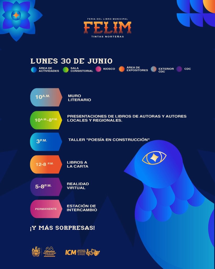 H. Ciudad de Chihuahua, Chih., a 13 de junio de 2025 – El Gobierno Municipal de Chihuahua, a través del Instituto de Cultura, invita a la primera edición de la Feria del Libro Municipal FELIM: Tintas Norteñas, una celebración literaria que tendrá lugar del 28 al 30 de junio, con entrada gratuita y actividades para todas las edades.