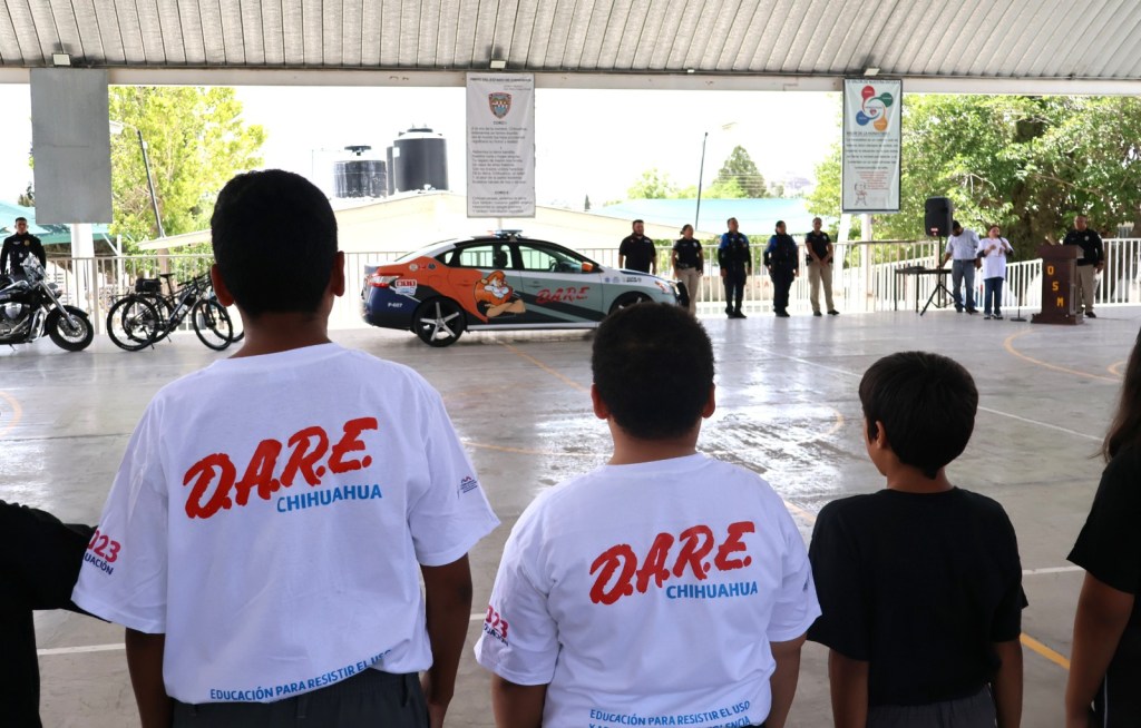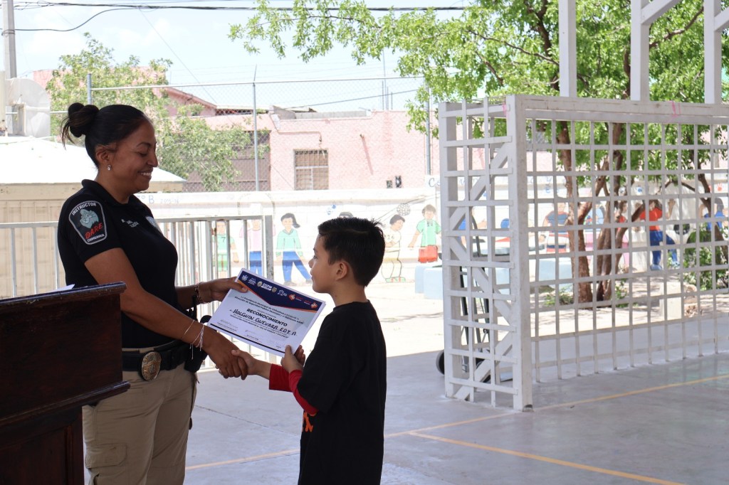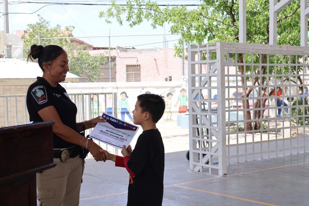 📅 H. Ciudad de Chihuahua, Chih. A 17 de junio de 2025.- En un emotivo acto, 69 niñas y niños del turno vespertino de la escuela primaria Oscar Soto Máynez, ubicada en la colonia Unidad Cuauhtémoc, se graduaron del programa «Educación para Resistir el Uso de las Drogas y la Violencia» (D.A.R.E.), impartido por elementos de la Policía Municipal.