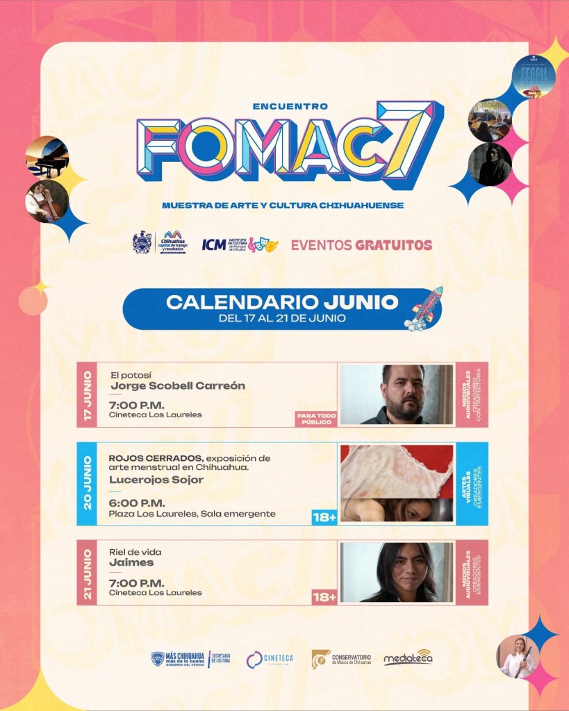 📍 H. Ciudad de Chihuahua, Chih., a 17 de junio de 2025.- El Gobierno Municipal, a través del Instituto de Cultura del Municipio, invita a toda la ciudadanía a ser parte del Encuentro FOMAC 7, una serie de actividades artísticas y culturales que se llevarán a cabo del 18 al 21 de junio con la participación de artistas locales.