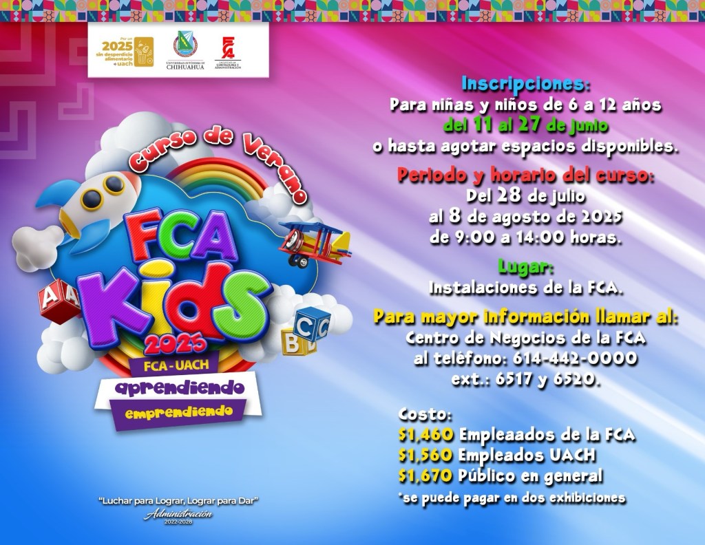 Este verano, la Facultad de Contaduría y Administración (FCA) de la UACH vuelve a abrir las puertas de su exitoso programa FCA Kids, el curso de verano diseñado para que niñas y niños de 6 a 12 años descubran el fascinante mundo del emprendimiento 💡🧠.