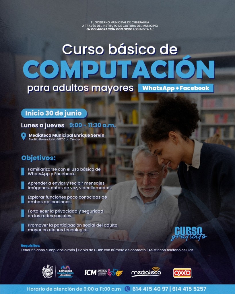 El Gobierno Municipal de Chihuahua, a través del Instituto de Cultura del Municipio, invita a las personas adultas mayores a inscribirse en el Curso Básico de Computación, que dará inicio el próximo 30 de junio en la Mediateca Municipal Enrique Servín.