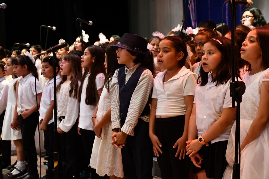 El Coro Monumental estuvo conformado por estudiantes del CEM y alumnas y alumnos de escuelas públicas como la Primaria Sección 42 No. 2204 y las Secundarias Estatales Benito Juárez No. 3008 y 3005.