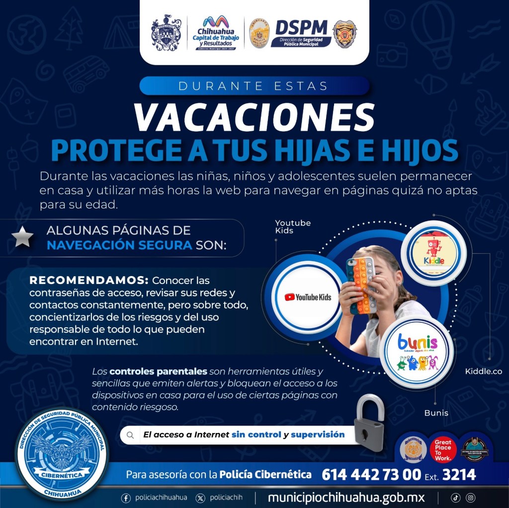 H. Ciudad de Chihuahua, Chih., a 25 de junio de 2025. – Ante el aumento del uso de internet por parte de niñas, niños y adolescentes durante el periodo vacacional, la Dirección de Seguridad Pública Municipal (DSPM), a través de su Policía Cibernética, emite recomendaciones para madres, padres y tutores con el objetivo de prevenir delitos virtuales que ponen en riesgo la integridad de los menores.