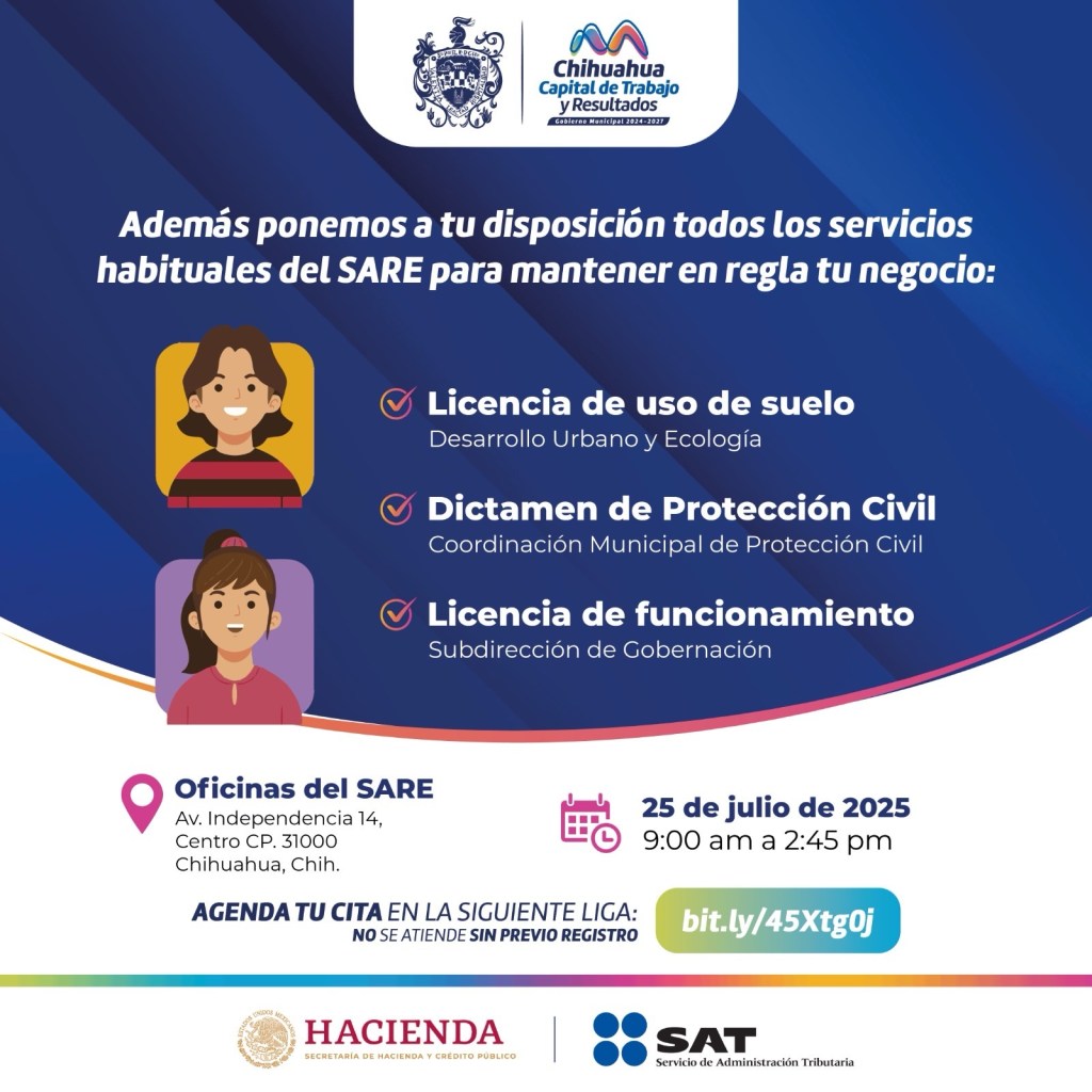 H. Ciudad de Chihuahua, Chih., a 11 de julio de 2025 – El Gobierno Municipal de Chihuahua, a través de la Dirección de Desarrollo Económico y Competitividad, en colaboración con el Servicio de Administración Tributaria (SAT), invita a la ciudadanía a aprovechar el programa “SAT en el SARE”, el próximo viernes 25 de julio, para realizar trámites fiscales y administrativos en un solo lugar.